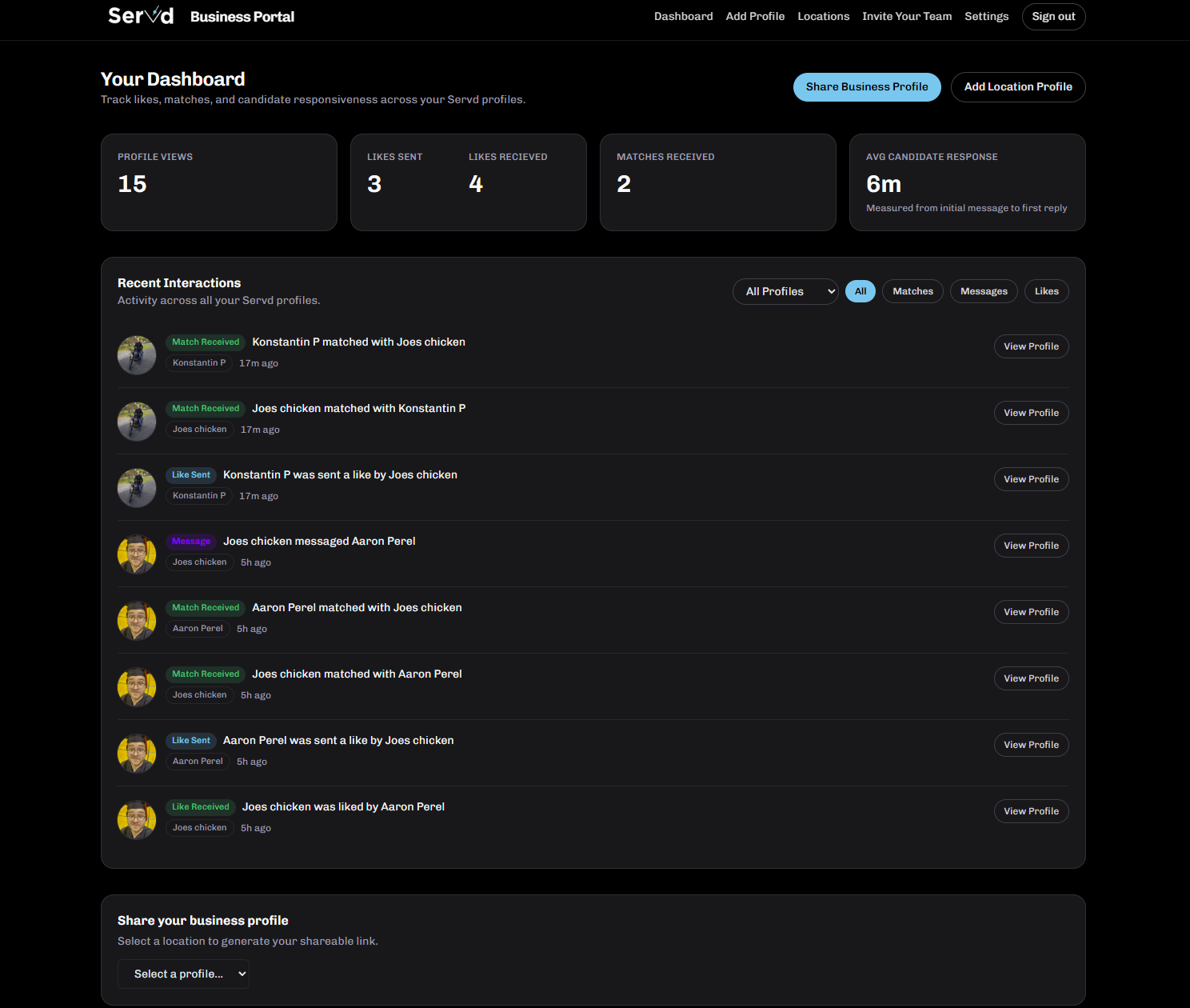 Track views, likes, matches, and response times.